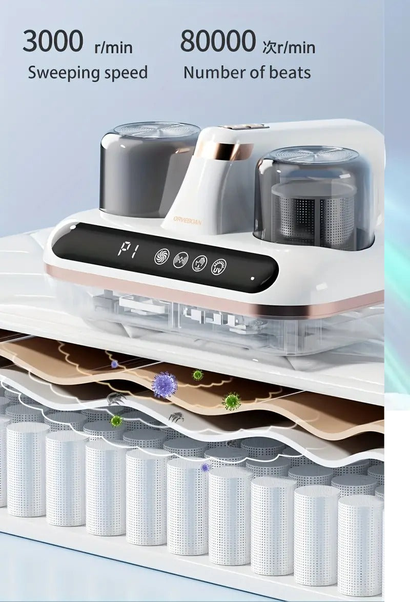 Dispositivo de limpieza y esterilización de alto rendimiento, diseñado para ofrecer una higiene profunda en colchones, camas, almohadas y superficies textiles.